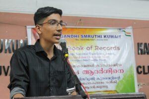 പ്രസ്തുത ചടങ്ങിൽ ശ്രീ ജനചിന്ത പ്രേം സ്വാഗതവും, രക്ഷാധികാരി ശ്രീ.ബേക്കൻ ജോസഫ് അധ്യക്ഷത വഹിക്കുകയും ഗാന്ധിസ്മൃതിയുടെ പ്രവർത്തനങ്ങളെ കുറിച്ച് വിവരിക്കുകയും തുടർന്ന് മാസ്റ്റർ ആദർശ് മറുപടി പ്രസംഗവും,
