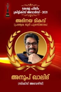 അഭിനയ ജീവിതത്തിൽ കിട്ടിയ ഈ വലിയ അംഗീകാരം, ഒരു തിലകക്കുറിയായി കൊണ്ടു നടക്കുമെന്ന് അനൂപ് ഖാലീദ് പറഞ്ഞു.കൊല്ലം സ്വദേശിയായ അനൂപ്, മിമിക്രി രംഗത്ത് പയറ്റിത്തെളിഞ്ഞ ശേഷമാണ് സിനിമയിൽ എത്തിയത്.മമ്മൂട്ടിയായിരുന്നു പ്രചോദനം.