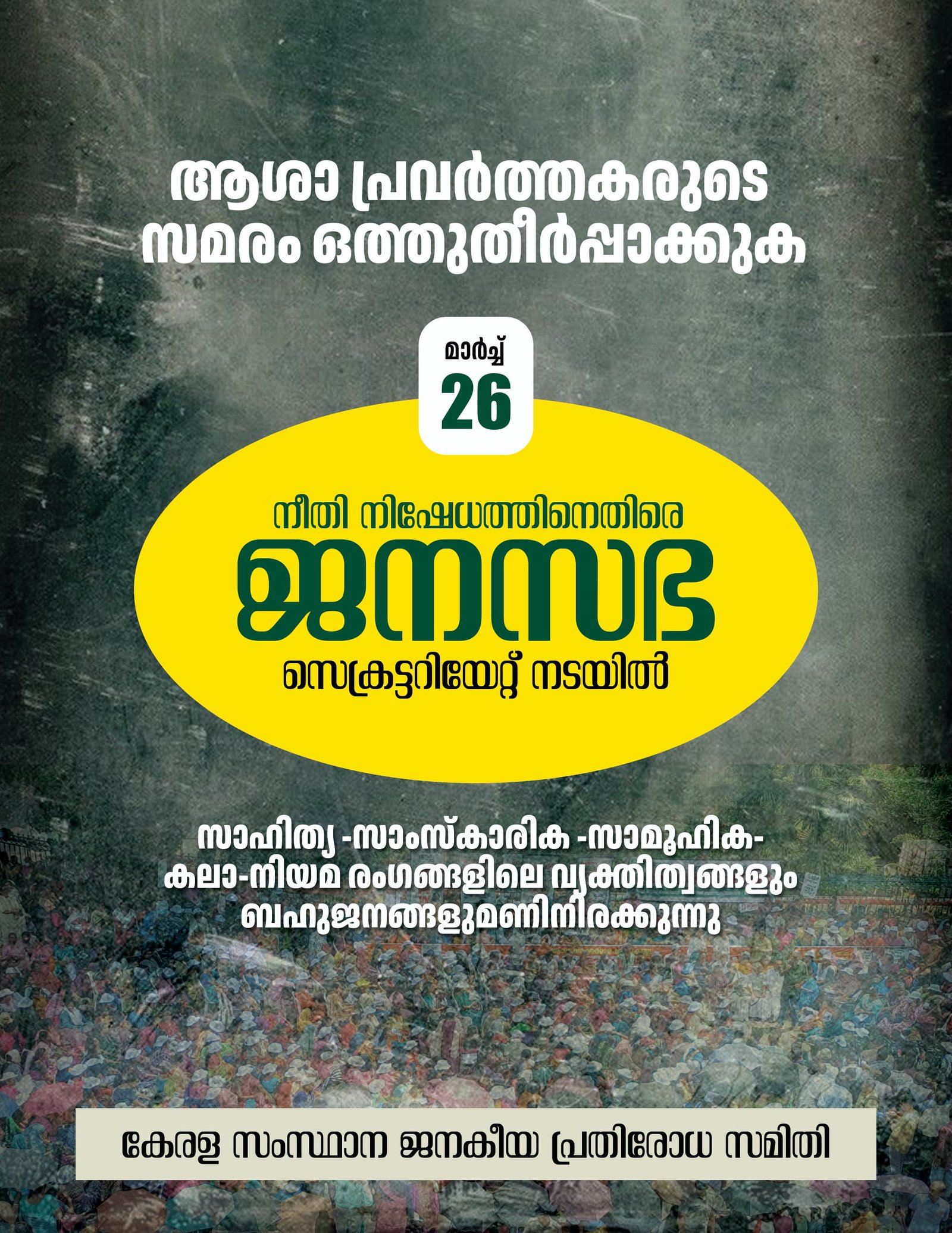 ആശാ വർക്കർമാർ ഹോണറേറിയ വർദ്ധനവും മറ്റ് ആനുകൂല്യങ്ങളും ആവശ്യപ്പെട്ടു കൊണ്ട് നടത്തിവരുന്ന സമരത്തിന് ഇനിയും പരിഹാരം കാണുവാൻ കഴിഞ്ഞിട്ടില്ല. മാസത്തിൽ കേവലം 7000 രൂപ ഹോണറേറിയത്തിൽ കേന്ദ്ര സർക്കാർ സ്കീമിൽ 26000 ത്തിലധികം വനിതാ ജീവനക്കാർ മാത്രം പണിയെടുക്കുന്ന ഒരു മേഖലയാണ് ആശമാരുടേത്. അതുകൊണ്ട് തന്നെ അവരുടെ ആവശ്യങ്ങൾ ജനാധിപത്യപരമായ രീതിയിൽ അനുഭാവപൂർവം പരിഗണിക്കേണ്ടത് കേന്ദ്ര- സംസ്ഥാന സർക്കാരുകളുടെ
