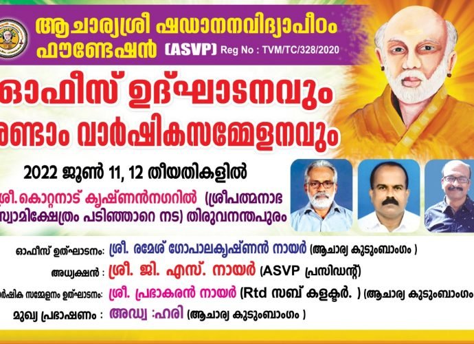 ഷഡാനനൻനായരുടെ പ്രവർത്തനങ്ങൾ സമൂഹത്തിൽ എത്തിച്ചത് ASVP :പ്രഭാകരൻ നായർ,ഷഡാനനൻനായരുടെ പ്രവർത്തനങ്ങൾ സമൂഹത്തിന് മാതൃക :രമേശ് ഗോപാലകൃഷ്ണൻ നായർ,ആചാര്യ സ്മൃതിയിലും, കുടുംബാംഗങ്ങളുടെ സാനിധ്യത്തിലും ASVP യുടെ രണ്ടാം വാർഷികവും, ഓഫിസ് ഉത്ഘാടനവും
