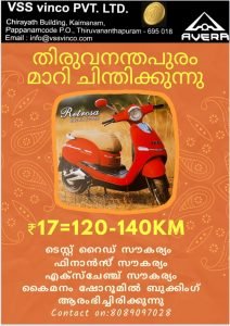 അനന്തപുരിയിൽ AVERA Retrosa യുടെ പുതിയ ഷോറൂം ആരംഭിക്കുന്നു കൈമനത്ത് ആരംഭിച്ചു.ഷോറൂമിൽ AVERA Retrosa ഇലക്ട്രിക്കൽ വാഹനം (SCOOTER) ഇപ്പോൾ ലഭിിക്കു൦ ഇറ്റാലിയൻ സ്റ്റൈൽ ജർമൻ ടെക്നോളജിയിൽ ഇന്ത്യയുടെ സ്വന്തം AVERA RETROSA ഇപ്പോൾ സ്വന്തമാക്കാൻ സുവർണ്ണ അവസരവും, ലളിതമായ ഫിനാൻസ് സൗകര്യവും ആകർഷകമായ എക്സ്ചേഞ്ച് സൗകര്യവും, ടെസ്റ്റ് റൈഡും ഇവിടെഒരുക്കിയിട്ടുണ്ട്.