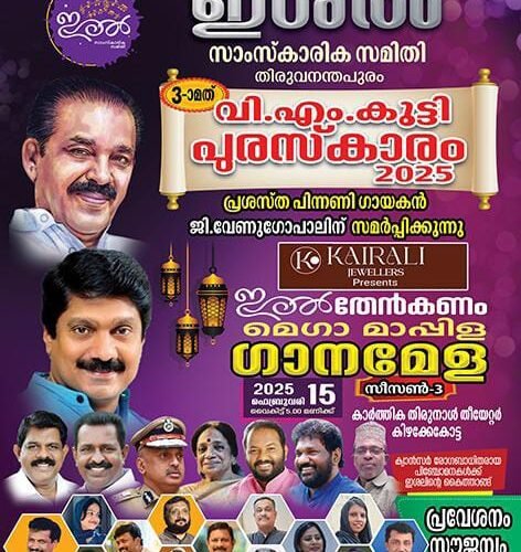 തിരുവനന്തപുരം : ഇശൽ സാംസ്കാരിക സമിതി ഏർപ്പെടുത്തിയ മൂന്നാമത് വി.എം കുട്ടി പുരസ്കാരം പിന്നണി ഗായകൻ ജി. വേണുഗോപാലിന് ഫെബ്രുവരി 15 ശനിയാഴ്ച വൈകിട്ട് 5 മണിക്ക് കിഴക്കേകോട്ട കാർത്തിക തിരുനാൾ തിയേറ്ററിൽRead More →