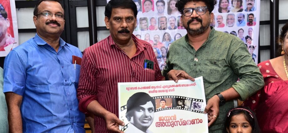 തിരുവനന്തപുരം :നടൻ ജയൻ അനുസ്മരണത്തോടനുബന്ധിച്ചു ദേശീയ മലയാളവേദിയും ഗ്ലോബൽ ഹെൽത്ത് ഓർഗനൈസേഷനും സംയുക്തമായി സംഘടിപ്പിച്ച ജയൻ അനുസ്മരണ ലോഗോ പ്രകാശന കർമ്മം ദേശീയ മലയാള വേദി ചെയർമാൻ പനച്ചമൂട് ഷാജഹാൻ സാമൂഹിക സാംസ്കാരിക പ്രവർത്തകൻ വിനയചന്ദ്രൻ നായർക്ക് കൈമാറി.