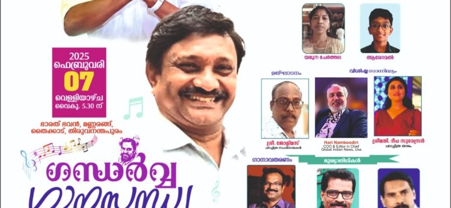 തിരുവനന്തപുരം :ഗായകനും ഗാനരചയിതാവുമായ അജയ് വെള്ളരിപ്പണയും സംഘവും അവതരിപ്പിക്കുന്ന ഗന്ധർവ്വ ഗാനസന്ധ്യ ഫെബ്രുവരി 7 വെള്ളിയാഴ്ച
