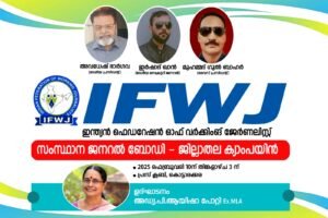 കൊല്ലം: ഇന്ത്യൻ ഫെഡറേഷൻ ഓഫ് വർക്കിംങ് ജേർണ്ണലിസ്റ്റ് (ഐ.എഫ്.ഡബ്ല്യു.ജെ) സംസ്ഥാന അംഗത്വ വിതരണോത്ഘാടനം, 10ന് തിങ്കളാഴ്ച പകൽ 3 ന് കൊട്ടാരക്കര പ്രസ്സ് ക്ലബ്ബിൽ നടക്കും. മുൻ എം.എൽ.എ അഡ്വ.പി. അയിഷ പോറ്റി ഉത്ഘാടനം നിർവ്വഹിക്കും.സംസ്ഥാന വർക്കിംഗ് പ്രസിഡൻ്റ് ചെമ്പകശ്ശേരി ചന്ദ്രബാബു അദ്ധ്യക്ഷത വഹിക്കും.മുതിർന്ന മാധ്യമ പ്രവർത്തകൻ എ.പി. ജിനൻ മുഖ്യപ്രഭാഷണം നടത്തും.