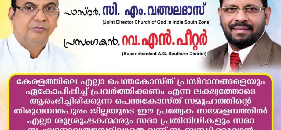 വെള്ളറട: കേരളത്തിലെ എല്ലാ പെന്തെക്കോസ്ത് പ്രസ്ഥാനങ്ങളേയും ഏകോപിപ്പിച്ച് പ്രവർത്തിക്കണം എന്ന ലക്ഷ്യത്തോടെ ആരംഭിച്ചിരിക്കുന്ന പെന്തെകോസ്ത് സമൂഹത്തിൻ്റെ തിരുവനന്തപുരം ജില്ലയുടെ സമ്മേളനം നവംബർ മുപ്പതിന് വെള്ളറടയിൽ നടക്കും. ശുശ്രൂഷകന്മാരും സഭാ പ്രതിനിധികളും പങ്കെടുക്കുന്ന ഈ യോഗം പാസ്റ്റർ സി.എം വത്സലദാസ് (ജോയിൻ്റ് ഡയറക്ടർ ചർച്ച് ഓഫ് ഗോഡ് ഇൻ ഇന്ത്യാ സൗത്ത് സോൺ) അധ്യക്ഷത വഹിക്കും. റവ. എൻ പീറ്റർ (സൂപ്രണ്ട് ഏ.ജി സതേൺ ഡിസ്ട്രിക്റ്റ് മുഖ്യ പ്രസംഗകനായിരിക്കും. പാസ്റ്റർ എ. ദൈവദാനം (ശാരോൻ ഫെലോഷിപ്പ് വെള്ളറട സെക്ഷൻ സെക്രട്ടറി) പാസ്റ്റർ ശോഭനദാസ് (ഐ.പി.സി ബാലരാമപുരം ഏര്യാ പ്രസിഡൻ്റ്) പാസ്റ്റർ ജാസ്പിൻ ജോൺ (ഐ.പി.സി തിരുവനന്തപുരം സൗത്ത് സെൻറർ സെക്രട്ടറി) ന്യൂ ഇന്ത്യാ ദൈവസഭ വൈ.പി.സി.എ കെ.കെ ഡിസ്ട്രിക്റ്റ് സെക്രട്ടറിയും പ്രയർ വേൾഡ് ഡകറക്ടറുമായ പാസ്റ്റർ സി.ബിനു എന്നിവർ യോഗത്തിൻ്റെ കൺവീനർമാരായി പ്രവർത്തിക്കും.
