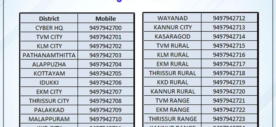 വാട്സ് ആപ്പ് നമ്പര്: സൈബര് ഹെഡ്ക്വാര്ട്ടേഴ്സ് 9497942700, തിരുവനന്തപുരം സിറ്റി 9497942701, തിരുവനന്തപുരം റൂറല് 9497942715, കൊല്ലം സിറ്റി 9497942702, കൊല്ലം റൂറല് 9497942716, പത്തനംതിട്ട 9497942703, ആലപ്പുഴ 9497942704, കോട്ടയം 9497942705, ഇടുക്കി 9497942706, എറണാകുളം സിറ്റി 9497942707, എറണാകുളം റൂറല് 9497942717, തൃശ്ശൂര് സിറ്റി 9497942708, തൃശ്ശൂര് റൂറല് 9497942718, പാലക്കാട് 9497942709, മലപ്പുറം 9497942710, കോഴിക്കോട് സിറ്റി 9497942711, കോഴിക്കോട് റൂറല് 9497942719, വയനാട് 9497942712, കണ്ണൂര് സിറ്റി 9497942713, കണ്ണൂര് റൂറല് 9497942720, കാസര്ഗോഡ് 9497942714, തിരുവനന്തപുരം റേഞ്ച് 9497942721, എറണാകുളം റേഞ്ച് 9497942722, തൃശ്ശൂര് റേഞ്ച് 9497942723, കണ്ണൂര് റേഞ്ച് 9497942724.