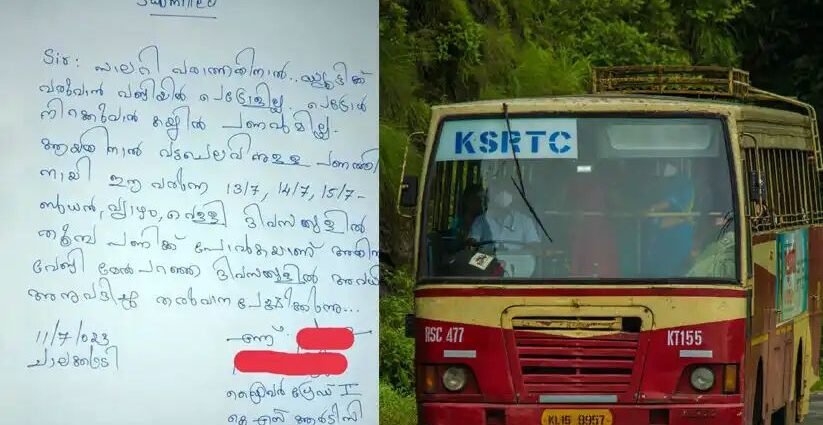 ചാലക്കുടി കെ.എസ്.ആര്.ടി.സി ഡിപ്പോയിലെ ഗ്രേഡ്-1 ഡ്രൈവറാണ് ചുരുങ്ങിയ വാക്കുകളില് ജീവിതദുരിതം വരച്ചുകാട്ടുന്ന അവധി അപേക്ഷ നല്കിയത്.
