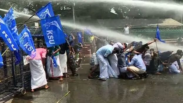 എന് സി ആര് ടി പാഠപുസ്തകത്തില് കാവിവല്ക്കരണം എന്ന് ആരോപിച്ചാണ് കെ എസ് യു പ്രവര്ത്തകര് മാര്ച്ച് നടത്തിയത്. പ്രവര്ത്തകര്ക്ക് നേരെ പൊലീസ് ജല പീരങ്കി പ്രയോഗിച്ചു.