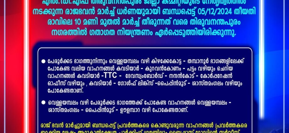 തിരുവനന്തപുരം :എൽഡിഎഫ് തിരുവനന്തപുരം ജില്ലാ കമ്മിറ്റിയുടെ നേതൃത്വത്തിൽ നടക്കുന്ന രാജഭവൻ മാർച്ച് ധർണയുമായി ബന്ധപ്പെട്ട് 05/12/2024 തീയതി രാവിലെ 10 മണി മുതൽ മാർച്ച് തീരുന്നത് വരെ തിരുവനന്തപുരം നഗരത്തിൽ ഗതാഗത നിയന്ത്രണം ഏർപ്പെടുത്തിയിരിക്കുന്നു.