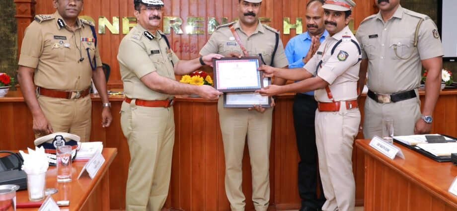 ഫോട്ടോ ക്യാപ്ഷന്: സംസ്ഥാനത്തെ ഏറ്റവും മികച്ച പോലീസ് സ്റ്റേഷനായും ദേശീയ തലത്തില് മികച്ച അഞ്ചാമത്തെ പോലീസ് സ്റ്റേഷനായും കേന്ദ്ര ആഭ്യന്തര മന്ത്രാലയം തെരഞ്ഞെടുത്ത പാലക്കാട് ജില്ലയിലെ ആലത്തൂര് പോലീസ് സ്റ്റേഷനിലെ ഉദ്യോഗസ്ഥര് പോലീസ് ആസ്ഥാനത്തു നടന്ന ചടങ്ങില് സംസ്ഥാന പോലീസ് മേധാവി ഡോ. ഷെയ്ഖ് ദര്വേഷ് സാഹിബ് ഐ.പി.എസില് നിന്നു പുരസ്കാരങ്ങള് ഏറ്റുവാങ്ങുന്നു.