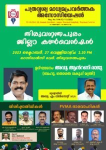 തിരുവനന്തപുരം:മാധ്യമ രംഗത്തെ ദൃശ്യ, പത്ര, ഓൺലൈൻ പ്രവർത്തകരുടെ കൂട്ടായ്മയായ കേരള പത്ര ദൃശ്യ മാധ്യമ പ്രവർത്തക അസോസിയേഷൻ ( PVMA ) തിരുവനന്തപുരം ജില്ലാ കൺവെൻഷൻ ഇന്ന് 3.30 ന് സെക്രട്ടറിയേറ്റിന് സമീപത്തെ റസിഡൻസി ടവറിൽ ഗതാഗത വകുപ്പ് മന്ത്രി ആൻറണി രാജു ഉദ്ഘാടനം ചെയ്യും. എം. വിൻസെന്റ് എം.എൽ.എ മുഖ്യപ്രഭാഷണം നടത്തും .