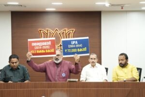 തിരുവനന്തപുരം: കേരളത്തെ നശിപ്പിച്ച പത്ത് വര്ഷമാണ് പിണറായി ഭരണത്തില് കടന്ന് പോയതെന്ന് ബിജെപി സംസ്ഥാന അധ്യക്ഷന് ശ്രീ രാജീവ് ചന്ദ്രശേഖര് കുറ്റപ്പെടുത്തി. യുപിഎ ഭരണകാലത്ത് 72,000 കോടി രൂപ മാത്രം കേരളത്തിന് ലഭിച്ചപ്പോൾ 2014 – 2024 കാലത്ത് 3.20 ലക്ഷം കോടി രൂപയാണ് മോദി സർക്കാർ കേരളത്തിന് കൈമാറിയതെന്നും രാജീവ് ചന്ദ്രശേഖർ വാർത്താ സമ്മേളനത്തിൽ പറഞ്ഞു.