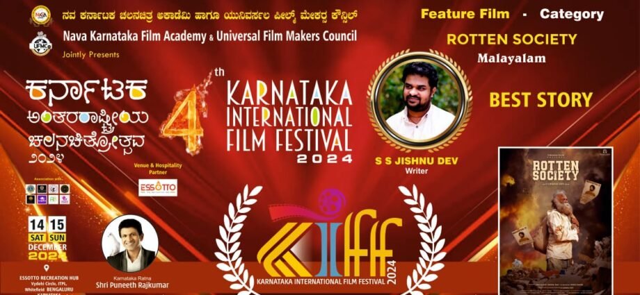 എസ് എസ് ജിഷ്ണു ദേവ് തിരക്കഥ എഴുതി സംവിധാനം നിർവഹിച്ച 70 ൽ പരം അവാർഡുകൾ സ്വന്തമാക്കിയ റോട്ടൻ സൊസൈറ്റി എന്ന മലയാള ചലച്ചിത്രം നാലാമത് കർണാടക രാജ്യാന്തര ചലച്ചിത്രമേളയിൽ മികച്ച കഥയ്ക്കുള്ള അവാർഡ് കരസ്തമാക്കിയിരിക്കുകയാണ്.