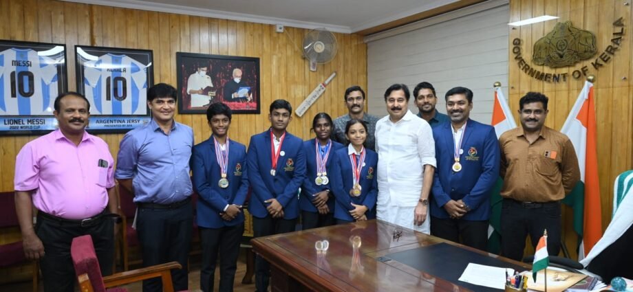 അഭിമന്യു വി നായർ ,ആരോൺ മാത്യു , ഭദ്ര ആർ നായർ എന്നിവരെയാണ് മന്ത്രി ആദരിച്ചത്. മിനി ഗോൾഫ് സംസ്ഥാന സെക്രട്ടറി വിനോദ് കുമാർ ,ടെക്നിക്കൽ കമ്മിറ്റി ചെയർമാൻ അഹമ്മദ് റസിൻ, സ്പോർട്സ് കൗൺസിൽ അംഗം ബോബി സി ജോസഫ് , മിനി ഗോൾഫ് സംസ്ഥാന ഭാരവാഹികളായ അജയ് കുമാർ , അനീഷ് കുമാർ , സുജിത് പ്രഭാകർ എന്നിവർ പങ്കെടുത്തു. ഇക്കഴിഞ്ഞ ഒക്ടോബർ 10 മുതൽ 13 വരെയാണ് മത്സരം നടന്നത്.