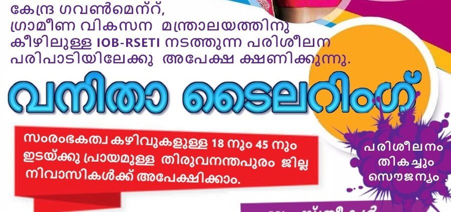 തിരുവനന്തപുരം :കേന്ദ്ര- സംസ്ഥാനസർക്കാരുകളുടെ നിയന്ത്രണത്തിൽ തിരുവനന്തപുരം വഴുതയ്ക്കാട് പ്രവർത്തിക്കുന്ന ഗ്രാമീണ സ്വയംതൊഴിൽ പരിശീലന കേന്ദ്രത്തിൽ 30 ദിവസത്തെ സൗജന്യ സ്വയംതൊഴിൽ പരിശീലന പരിപാടി 27.06.2022 ന് ആരംഭിക്കുന്നു.താങ്കൾ 18 നും 45 നും ഇടയ്ക്കു പ്രായമുള്ള തിരുവനന്തപുരം ജില്ലാ നിവാസിയാണെങ്കിൽ ഉടനെ രജിസ്റ്റർ ചെയ്യുക *
