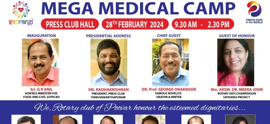 തിരുവനന്തപുരം : തിരുവനന്തപുരം പ്രസ് ക്ലബ്ബും പൂവാർ റോട്ടറി ക്ലബ്ബും സംയുക്തമായി സംഘടിപ്പിക്കുന്ന മെഗാ മെഡിക്കൽ ക്യാമ്പ് നാളെ രാവിലെ 9 30ന് പ്രസ് ക്ലബ് ഹാളിൽ നടക്കും. തിരുവനന്തപുരം അനന്തപുരി ഹോസ്പിറ്റൽ, മൂകാംബിക മെഡിക്കൽ കോളേജ് കുലശേഖരം, പി എം എസ് ഡെന്റൽ കോളേജ് വട്ടപ്പാറ, സരസ്വതി ഹോസ്പിറ്റൽ പാറശ്ശാല, ആദിരേഖ ആയുർവേദ ഹോസ്പിറ്റൽ പേരൂർക്കട, ശാരദ കൃഷ്ണ ഹോമിയോപ്പതിക് മെഡിക്കൽ കോളേജ് കുലശേഖരം എന്നീ ആശുപത്രികളുടെ സഹകരണത്തോടെ നടത്തുന്ന ക്യാമ്പ് മന്ത്രി ജി ആർ അനിൽ ഉദ്ഘാടനം ചെയ്യും. പ്രസ് ക്ലബ് പ്രസന്റ് എം രാധാകൃഷ്ണൻ അധ്യക്ഷത വഹിക്കുന്ന ചടങ്ങിൽ ഡോ. ജോർജ് ഓണക്കൂർ മുഖ്യ അതിഥിയായിരിക്കും. റോട്ടറി ഡിസ്ട്രിക്ട് ചെയർമാൻ ഡോക്ടർ മീര ജോൺ, പ്രസ് ക്ലബ് സെക്രട്ടറി കെ.എൻ സാനു, റോട്ടറി ഭാരവാഹികളായ രാജൻ വി പൊഴിയൂർ, അഡ്വ.എ. അജികുമാർ തുടങ്ങിയവർ പങ്കെടുക്കും.