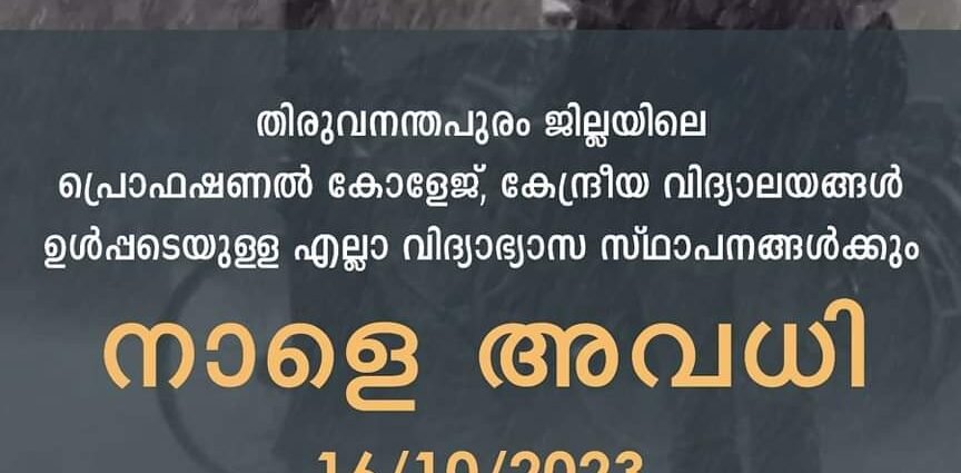 തിരുവനന്തപുരം ജില്ലയിൽ പ്രൊഫഷണൽ കോളേജ്, കേന്ദ്രീയ വിദ്യാലയങ്ങൾ ഉൾപ്പെടെയുള്ള എല്ലാ വിദ്യാഭ്യാസ സ്ഥാപനങ്ങൾക്കും നാളെ(ഒക്ടോബർ 16) ജില്ലാ കളക്ടർ ജെറോമിക് ജോർജ് ഐ. എ. എസ് അവധി പ്രഖ്യാപിച്ചു. ജില്ലയിൽ അതിശക്തമായ മഴ തുടരുന്ന സാഹചര്യത്തിലാണ് അവധി നൽകിയത്.