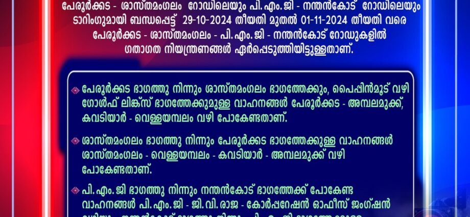 തിരുവനന്തപുരം :പേരൂർക്കട-ശാസ്തമംഗലം റോഡിലെയും പി.എം.ജി നന്തൻകോട് റോഡിലെയും ടാറിംഗുമായി ബന്ധപ്പെട്ട് 29-10-2024 തീയതി മുതൽ 01-11-2024 തീയതി വരെ പേരൂർക്കട-ശാസ്തമംഗലം , പി.എം.ജി -നന്തൻകോട് റോഡുകളിൽ ഗതാഗത നിയന്ത്രണങ്ങള് ഏർപ്പെടുത്തിയിട്ടുള്ളതാണ്.