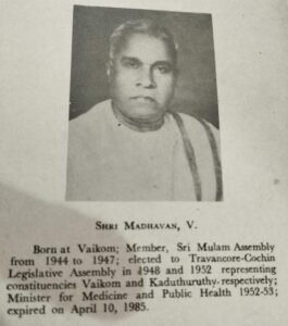 നവോത്ഥാ കാലഘട്ടത്തിൽ പൊതുജീവിത്തിൽ ജ്വലിച്ചു നിന്നിരുന്ന പ്രതിഭാശാലികളിൽ ഒരാളായിരുന്നു വി.മാധവൻ വക്കീൽ.1895-ൽ വൈക്കം മണക്കുന്നത്തുള്ള ഒരു പുരാതന കുടുംബത്തിൽ ജനിച്ചു.മാണി – വാവ മാതാപിതാക്കൾ. വൈക്കം ഗവമെൻ്റ് ഹൈ സ്കൂൾ, തിരുവനന്തപുരം ആർട്